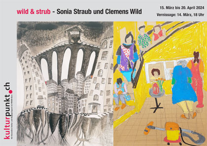 Es freut uns sehr, Sie - nach sanfter Auffrischung des kulturpunkt im PROGR Bern - zu unserer nächsten Ausstellung einladen zu können. Die beiden Künstler:innen Sonia Straub und Clemens Wild zeigen Ihnen neuere Werke aus ihrem jeweiligen Schaffen. Mit Augenzwinkern präsentieren sie die Ausstellung unter dem Titel: «wild & strub». Die Vernissage findet am Donnerstag, 14. März 2024, ab 18 Uhr statt.