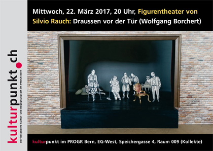 Ein einzigartiges, multimediales Theatererlebnis bieten wir Ihnen am Mittwoch, 22. März (20 Uhr): «Draussen vor der Tür» von Wolfgang Borchert. Silvio Rauch hat das Stück als Papiertheater inszeniert und spielt es zusammen mit Jill Aeschlimann im kulturpunkt.