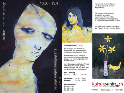 Am Donnerstag, 16. März (ab 18 Uhr) laden wir Sie zur Vernissage der Ausstellung von Salam Ahmad in den kulturpunkt ein. Salam Ahmad, geboren 1970, hat in Aleppo und Damaskus Philosophie und Malerei studiert und lebt seit drei Jahren in Olten. Ausstellungen in Zug, Solothurn, Luzern und im Kunsthaus Zofingen zeugen von seiner ungebrochenen Schaffenskraft.