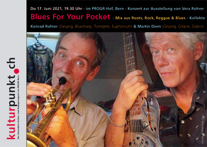 Im Rahmen der kulturpunkt-Ausstellung: Vera Rohrer - Ronja und die Räuberbande (noch bis zum 26.6.) tritt am 17. Juni, 19.30 Uhr das Duo «Blues For Your Pocket» im PROGR-Hof auf.