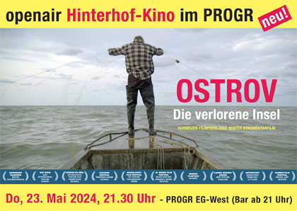 Unser neues Veranstaltungsformat – openair Hinterhof-Kino im PROGR-Westflügel – haben wir im März-Newsletter angekündigt. Am Donnerstag, 23. Mai, 21.30 Uhr ist es soweit: Die vierköpfige Projektgruppe* präsentiert Ihnen den mehrfach preisgekrönten Kinodokumentarfilm: «OSTROV - Die verlorene Insel» (CH 2021, 91 Min.) von Svetlana Rodina und Laurent Stoop. Im Anschluss an die Filmprojektion findet ein Gespräch mit der Regie statt. Die mobile PROGR-Bar versorgt die Besucher:innen mit Drinks und Snacks. Eintritt: Kollekte.