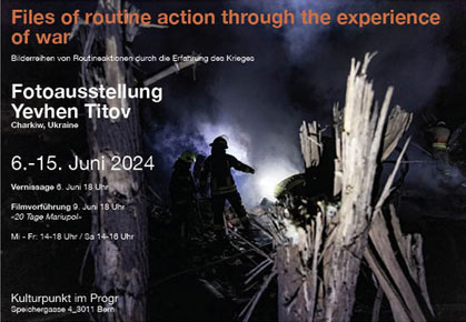 Am 6. Juni, ab 18 Uhr findet im kulturpunkt die Vernissage zur Fotoausstellung von Yevhen Titov statt. Unter dem Titel «Files of routine action through the experience of war» bieten seine Bilder Einblicke in den Lebensalltag der Ukrainer*innen in Kharkiv: Auswirkungen des Kriegs, Traumatas, Flucht, Verlust, Zerstörung, Leben, Kultur, Zukunftsperspektiven. Die Fotoausstellung dauert bis zum 15. Juni. Öffnungszeiten: Mi-Fr: 14-18 Uhr, Sa: 14-16 Uhr; Eintritt: Kollekte.
