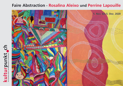Unter Gewährleistung dieser Schutzmassnahmen freuen wir uns, die Ausstellung Faire Abstaction am Donnerstag, 5. November (ab 18 Uhr) für Sie eröffnen zu können. Wir präsentieren Ihnen Werke von Rosalina Aleixo und Perrine Lapouille. Und bieten Ihnen damit einen einzigartigen Blick auf das aktuelle Kunstschaffen in der Westschweiz. Die Ausstellung ist in Zusammenarbeit mit Mir'arts (GE), dem Atelier Creahm in Fribourg und der Fondation Clair Bois in Vessey (GE) entstanden und dauert bis zum 5. Dezember. (Öffnungszeiten: Donnerstag von 14-18 Uhr, Freitag von 14-17.30 Uhr und am Samstag von 14-16 Uhr).