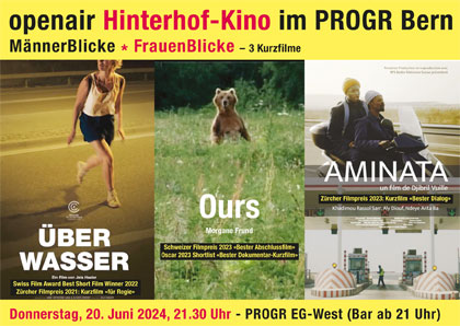 Nach dem geglückten Start des openair Hinterhof-Kinos im PROGR-Westflügel am 23. Mai mit dem Dokfilm «Ostrov», steht am Donnerstag, 20. Juni, 21.30 Uhr bereits das 2. Kino-Event bevor. Drei preisgekrönte Kurzfilme zum Thema «MännerBlicke - FrauenBlicke» stehen auf dem Programm: «ÜBER WASSER» von Jela Hasler (CH 2021,12 Min.), «OURS» von Morgane Frund (CH 2021, 19 Min.) und «AMINATA» von Djibril Vuille (CH 2023, 15 Min.).