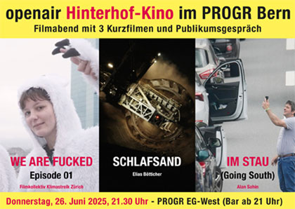 • Einen Filmabend mit 3 Kurzfilmen zum Thema Klima, am Donnerstag, 26. Juni, 21:30 Uhr im openair Hinterhof-Kino im PROGR-West mit anschliessendem Publikumsgespräch. Bei schlechtem Wetter im Atelier 368 im 3. Stock über der PROGR-Turnhalle.