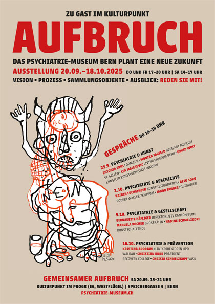 Vom 20. September bis 18. Oktober ist das Psychiatrie-Museum Bern einen ganzen Monat lang im kulturpunkt zu Gast! Das Museum plant eine neue Zukunft, in die die Projektleiterinnen Sara Stocker und Sandra Winiger mit einer Ausstellung und vier Gesprächsrunden starten. Der Aufbruch beginnt am Samstag, 20. September, von 15 bis 21 Uhr. Sie sind herzlich eingeladen. Detaillierte Informationen finden Sie unter: Psychiatrie-Museum.ch.