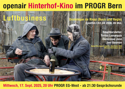 Am Mittwoch, 17. September, 20.00 Uhr läuft im openair Hinterhof-Kino im PROGR-Westflügel die vierte und für diese Saison letzte Film-Vorführung. Gezeigt wird Dominique de Rivaz' Spielfilm «Luftbusiness» (CH 2008, 89 Min.). Die Regisseurin konstruiert «mit viel Anmut eine kurze philosophische Fabel, die die Grenzen einer Gesellschaft hinterfragt, in der allem ein Marktwert zugewiesen werden kann.» (Décadrages, No 13).